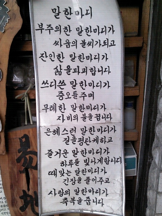 말 한마디 category 落書 2019. 12. 23. 23:53 by PROTAX 부주의한 말 한마디가 싸움의 불씨가 되고잔인한 말 한마디가 삶을 파괴합니다. 쓰디쓴 말 한마디가 증오를 주며 무례한 말 한마디가 자비의 불을 끕니다. 은혜스런 말 한마디가 길을 평탄케 하고즐거운 말 한마디가 하루를 빛나게 합니다. 때 맞는 말 한마디가 긴장을 풀어주고사랑의 말 한마디가 축복을 줍니다. 공유하기 게시글 관리 세무이슈와 업종별 세무회계 가이드 댓글 , 엮인글