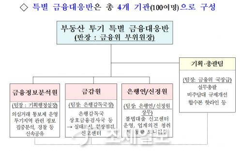금융대응반은 #금융위원회, #금융정보분석원, #금융감독원, #은행연합회, #신용정보원 이 함께 참여하여 4개 기관의 100여명으로 구성되며 부동산 투기대응 관련 금융부문의 컨트롤타워 역할을 수행하게 된다.