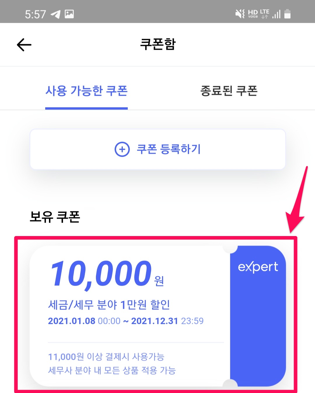 네이버 엑스퍼트 쿠폰 등록 및 사용방법 (휴대폰, 모바일 기준) category 업무소개 2021. 10. 30. 06:43 by PROTAX 휴대폰, 모바일에서 네이버 엑스퍼트 쿠폰 등록 및 사용방법 우측 상단 프로필 아이콘 클릭 가운데 쿠폰함 메뉴 클릭 쿠폰 등록하기 클릭 쿠폰 번호 입력 엑스퍼트 쿠폰 등록 완료 구매하기 버튼 누르면 등록했던 쿠폰 사용 가능 공유하기 게시글 관리 세무이슈와 업종별 세무회계 가이드 저작자표시 비영리 변경금지 (새창열림) 댓글 , 엮인글