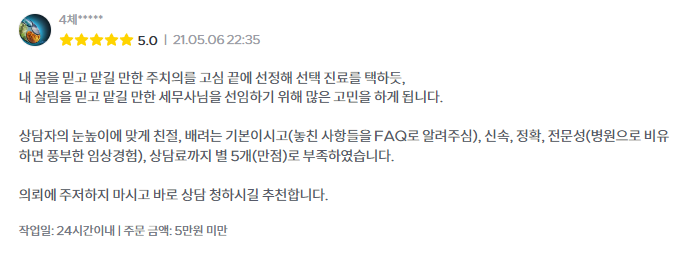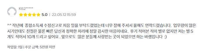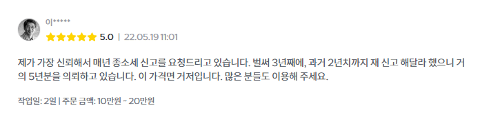 실제로 저희 서비스를 이용해보신 후 만족하셔서 과거 신고서 검토까지 의뢰하시는 경우도 많습니다. 과거 5년 이내 신고한 것이라면 추가적인 절세가 가능할 수도 있으니까요.