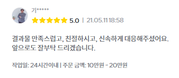 작업 소요 시간은 의뢰 후 수일 소요되는 경우도 있으나, 소통 및 자료 협조가 빠르게 이루어진다면 대부분 1일 이내에 처리됩니다.