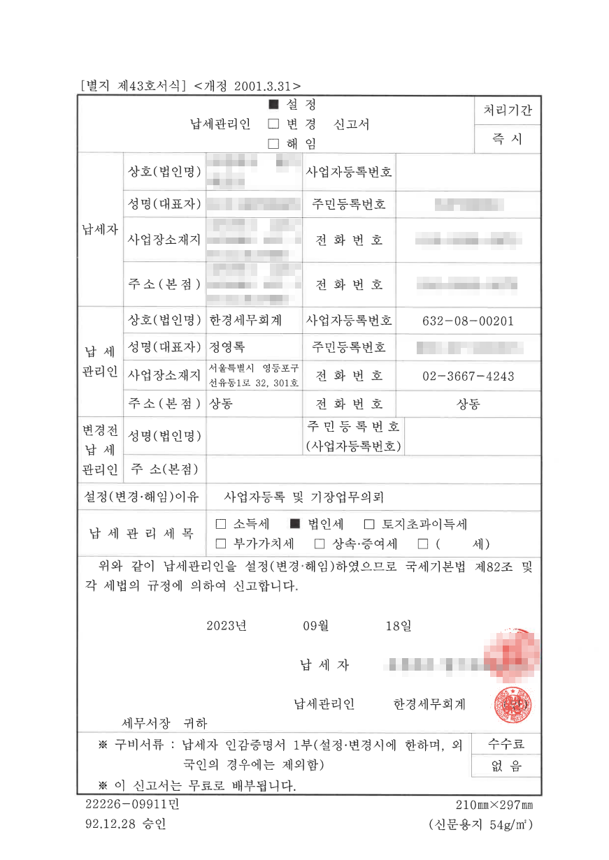 참고하실 수 있도록 납세관리인 설정 신고서 예시를 첨부해드립니다.