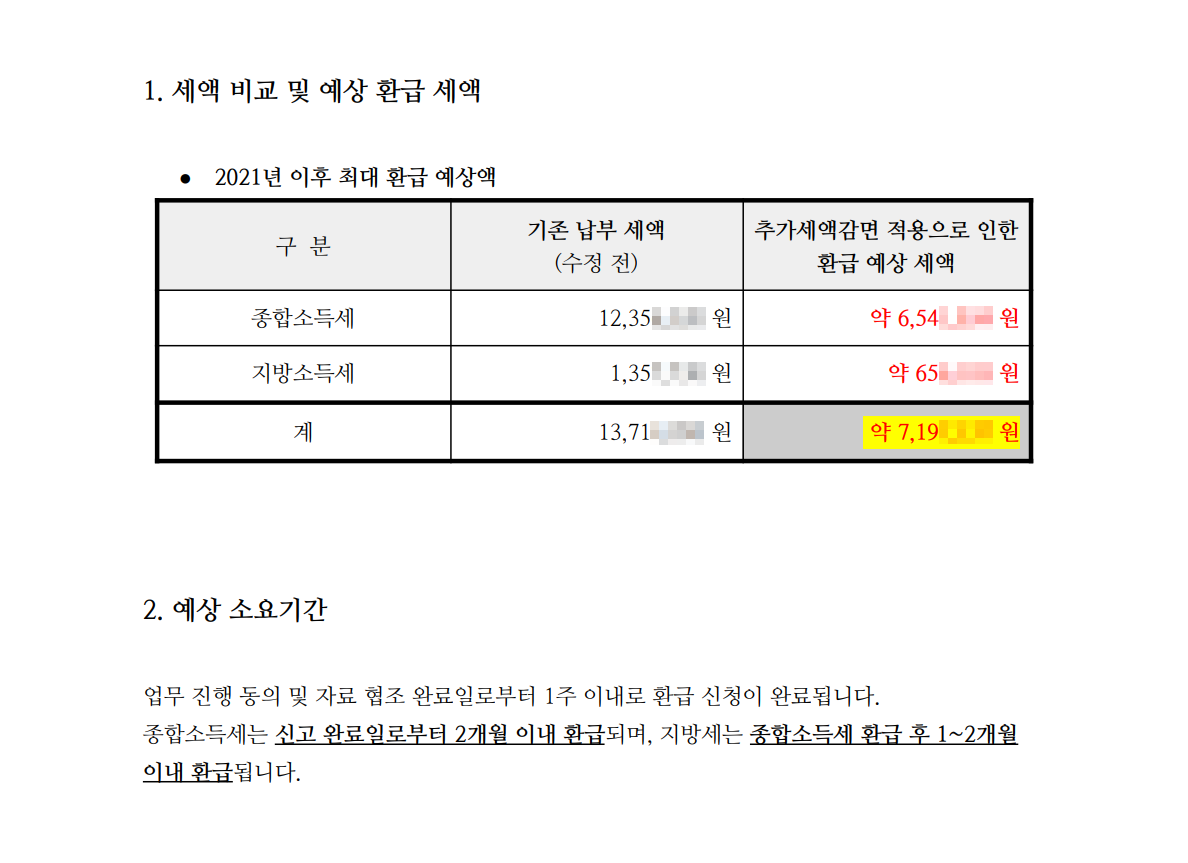 위의 경정청구 제안서는 2021년부터 2022년까지 2년 치 내용을 합산해서 작성했기 때문에 환급 예상 세액에는 조금 차이가 있다는 점을 감안하고 봐주시면 되겠습니다.