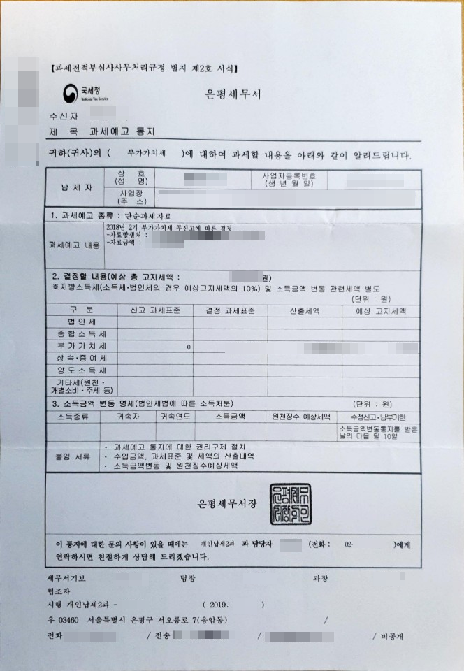 2018년 2기 부가가치세 무신고에 따른 과세예고 통지.