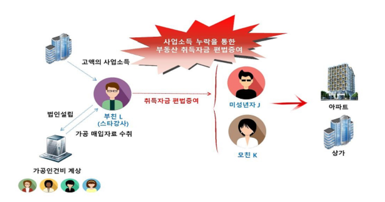스타강사 L 씨는 자신이 운영하는 법인에서 가공 세금계산서를 수취하는 방식으로 사업소득을 탈루했는데, 이렇게 신고하지 않은 L 씨의 소득은 자녀 J와 배우자 K가 부동산을 취득하는 자금으로 쓰였다.