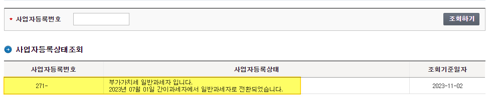 아래 이미지를 보면 저희가 제출한 경정청구 신고서가 받아들여진 후 과세유형이 다시 간이과세자로 전환된 것을 확인할 수 있습니다.
