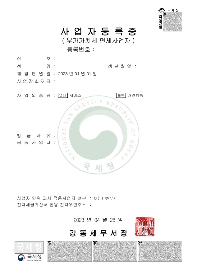 개인 방송 또는 1인 미디어 창작자(유튜버, 스트리머, BJ 등) 사업자 등록을 원하신다면 고민하지 마시고 언제든지 문의하세요.
