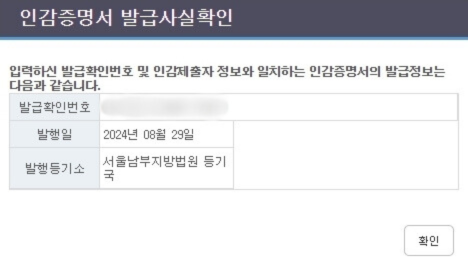 인감증명서에 있는 발급확인번호 12자리 등 정보 기입하면 아래와 같이 인감증명서 발급사실을 확인할 수 있습니다